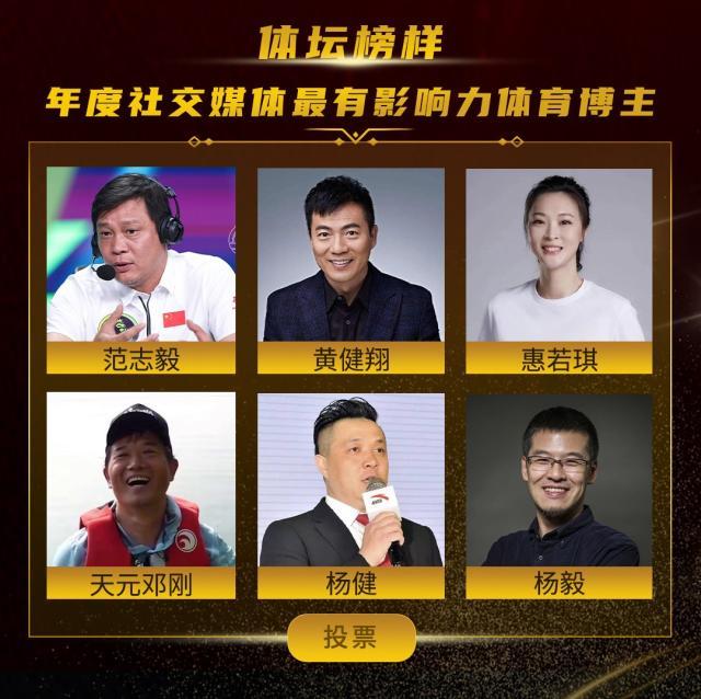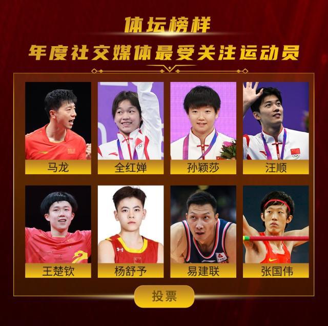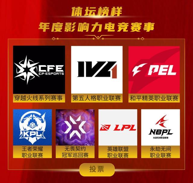 电子竞技和社媒领域的奖项,由大众评委通过投票决定,包括:年度影响力电竞选手、电竞赛事、电竞俱乐部,以及社交媒体最受关注运动员、社交媒体最有影响力体育博主。